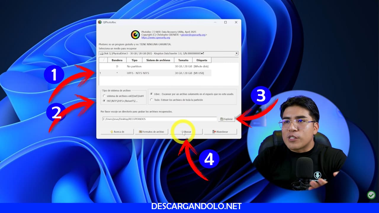 4. Luego en el programa, primero, selecciona tu memoria USB (o que vas a recuperar), luego selecciona el tipo de sistema de archivo (FAT/NTFS), después ubica donde vas a guardar los archivos recuperados (agrega aquí la carpeta que creamos en el escritorio) y por último selecciona en “Buscar” para que el programa realizé su trabajo.